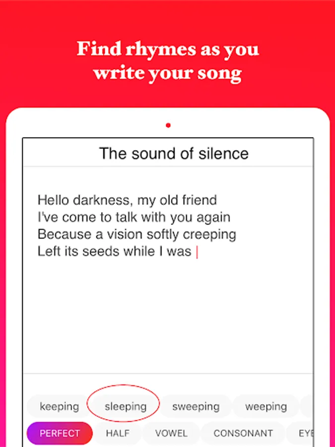Whether you're looking to put on the finishing touches of a love poem or song, bust out the next rap lyric, or just seeking some clever wordplay for your English assignment, give the app a try!