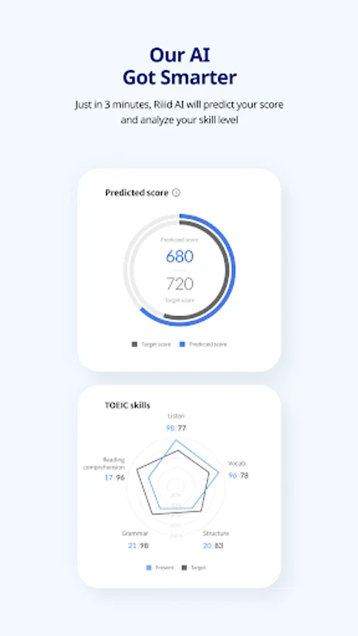 Riiid AI was recognized for its world top tier technology and was selected as one of the Top 2 global EdTech companies. Based on an overwhelming 300 million TOEIC study data, Riiid AI enables you to achieve your target score in the fastest period possible.