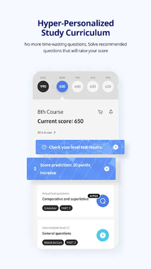 It will analyze your weaknesses by Part (Listening, vocabulary, grammar, etc.) and recommend a personalized study to increase your score in the fastest period.