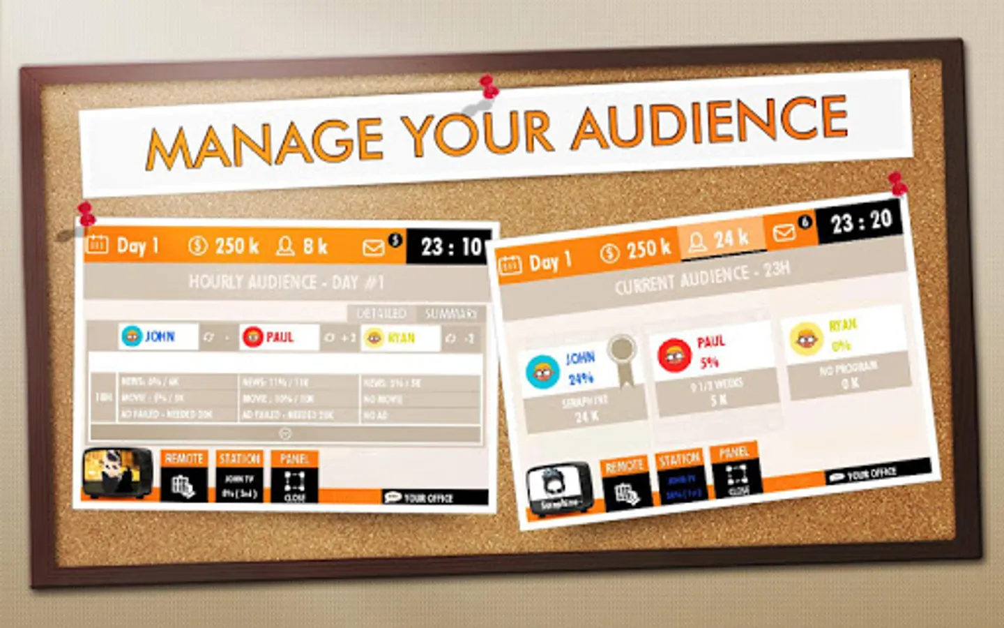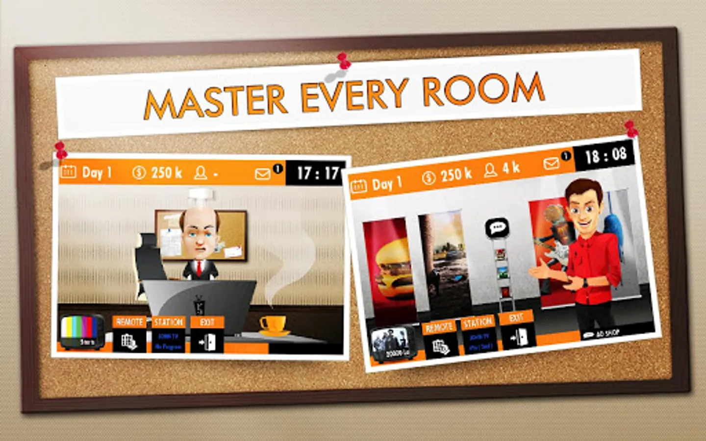 Manage your own TV Station! A novel game on Tycoon / Theme / Sim / Story genre.