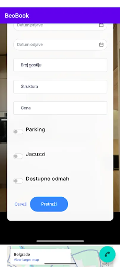 BeoBook je sveobuhvatna Android aplikacija dizajnirana da pojednostavi proces pronalaženja i rezervisanja smeštaja po principu "stan na dan", sa posebnim fokusom na dinamičnu ponudu u Beogradu. Bilo da dolazite turistički, poslovno ili vam je potreban privremeni smeštaj u prestonici, BeoBook nudi intuitivno i efikasno rešenje.