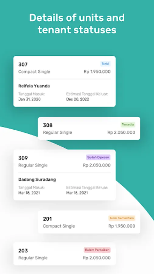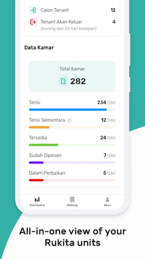 Let us tell you a few amazing things you can accomplish with this app; a bird's eye view and the latest updates of your Rukita properties, monthly reports, and you're also able to check out specific updates of room and tenant's details - this includes insights for potential new tenants, too!