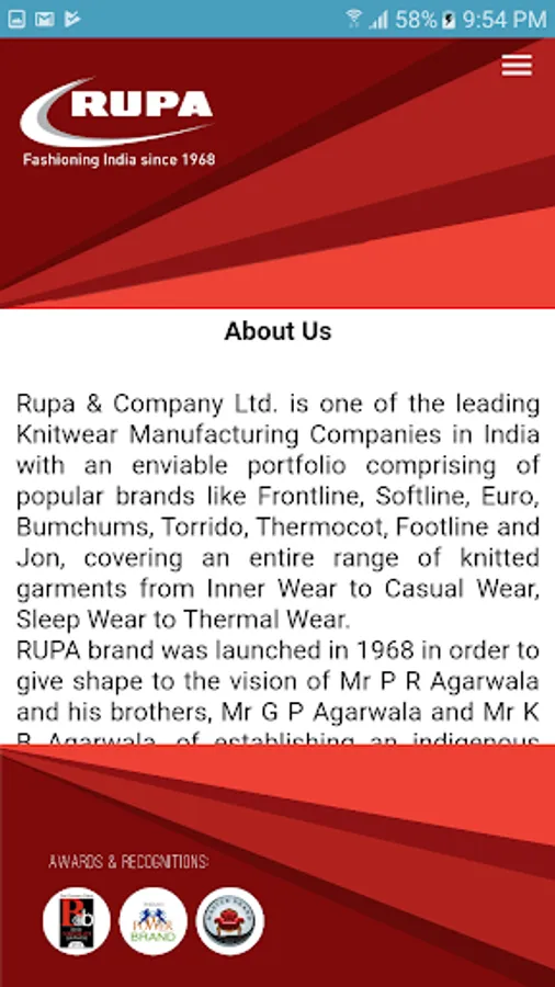 RUPA brand was launched in 1968 in order to give shape to the vision of Mr P R Agarwala and his brothers, Mr G P Agarwala and Mr K B Agarwala, of establishing an indigenous knitwear brand that would cater to the daily inner wear needs of men, women and kids alike. The Company has come a long way from its humble beginnings in the bylanes of Kolkata (then Calcutta) to become a fashion-forward brand with a strong brand presence across the country. The Company is also moving rapidly to make its presence felt in the international arena, especially in GCC, Africa and Asia Pacific.