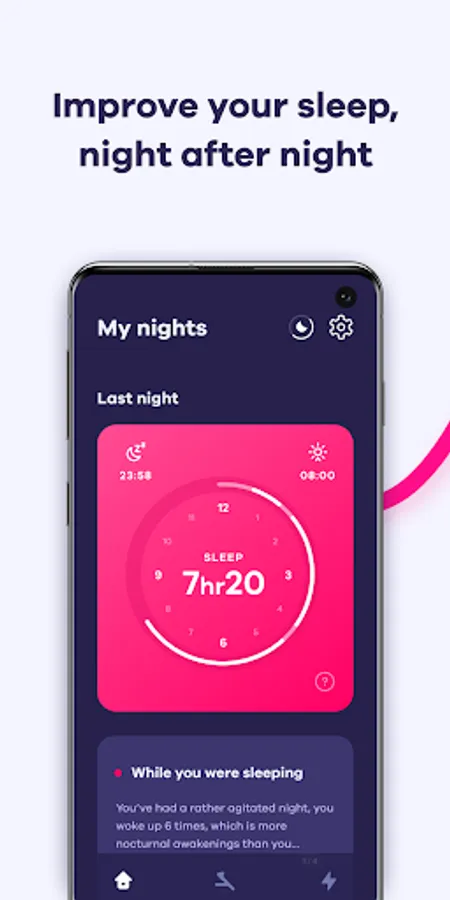 Your night card: Everything you need to understand your sleep sent to your phone every morning, including: how long it took to fall asleep, how many times you woke up, total sleep duration, sleep efficiency etc…