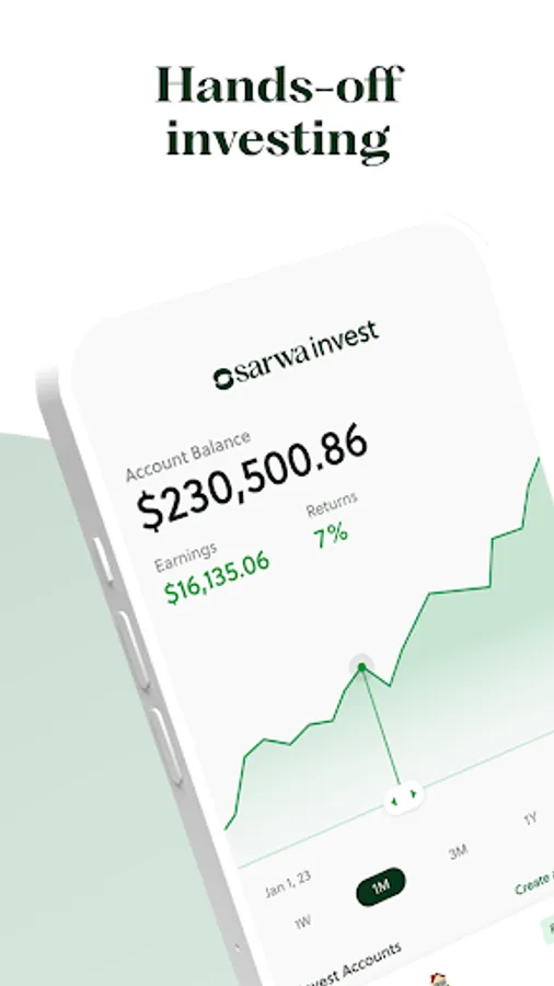 Looking for a hands-off investment to make your money work? With Sarwa Invest, we build you a globally diversified portfolio of Exchange-Traded Funds across assets, that reflect your risk profile and values. Once your account is funded, we take care of the rest from dividend reinvesting to portfolio rebalancing.