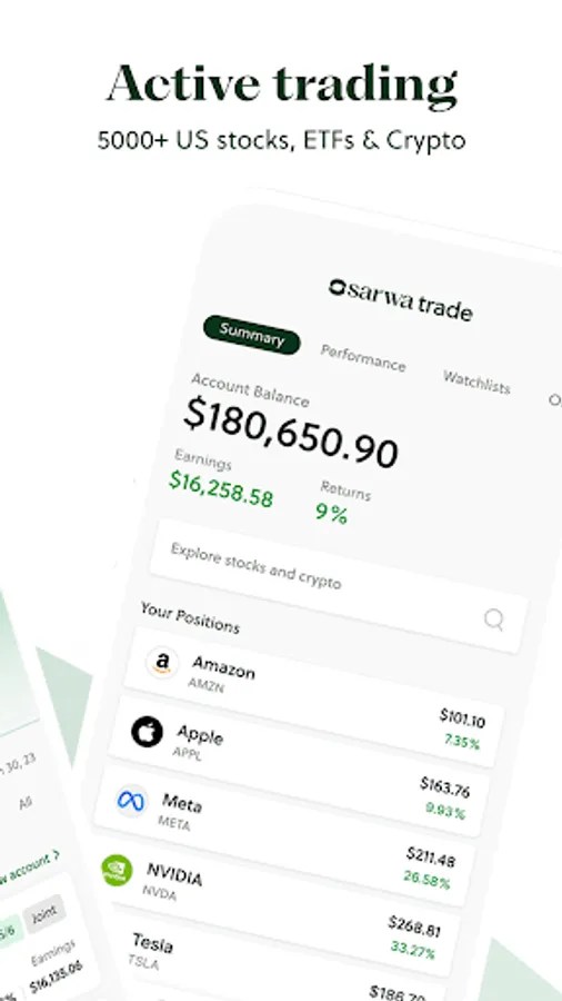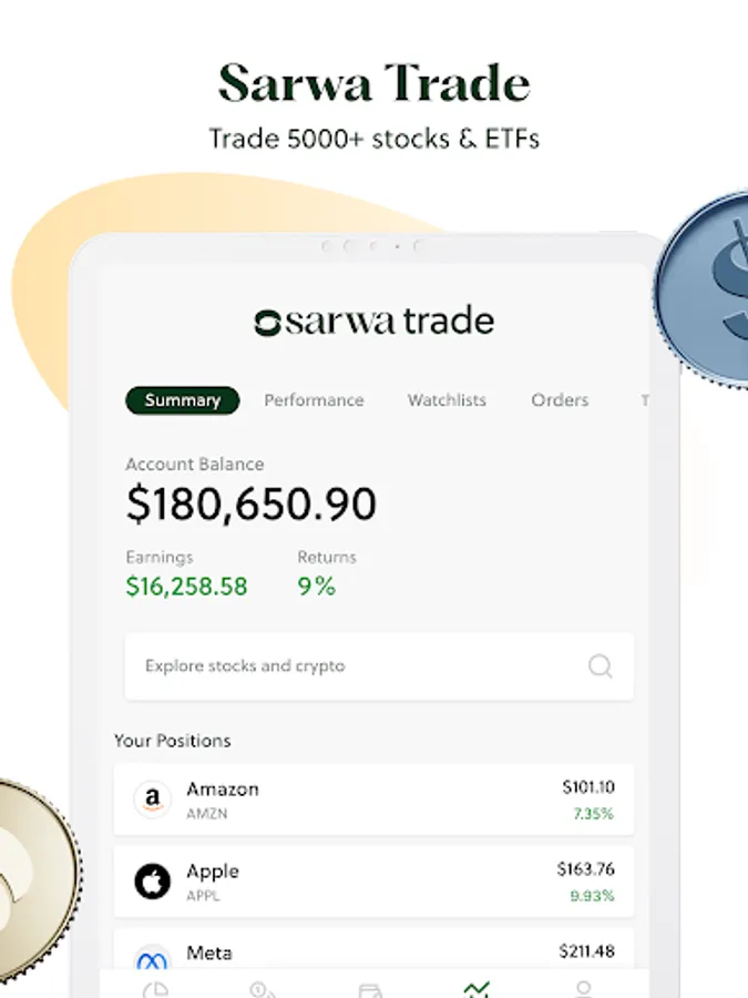 With Sarwa Trade you can easily invest in companies you believe in. Sarwa Trade delivers self-directed trading of thousands of U.S. stocks and ETFs. Sarwa also provides you the ability to buy and sell your favorite cryptocurrencies with Sarwa Crypto.
