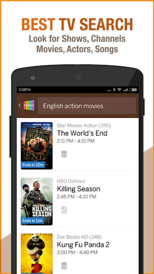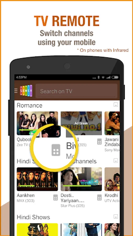 The best guide, search and remote for TV schedules and listings: Sensy allows you to search by an actor, to see movies played through the week. You can also search by the show's name, genre, or even channel name. Navigating through the guide is a breeze. You can search across 450 channels, 9800 shows, and 14 languages. Sensy covers all major Indian channels like Zee TV, Colors, Sun TV, Star Plus, Star Movies, Star World, HBO, NDTV, Animax, Pogo, Zee Studio, Zee Cafe, Zee Cinema, Set Max, Sony Mix, Sony PIX, Udaya TV, Asianet, Romedy Now, Jaya TV, 9xm, Colors regional etc.