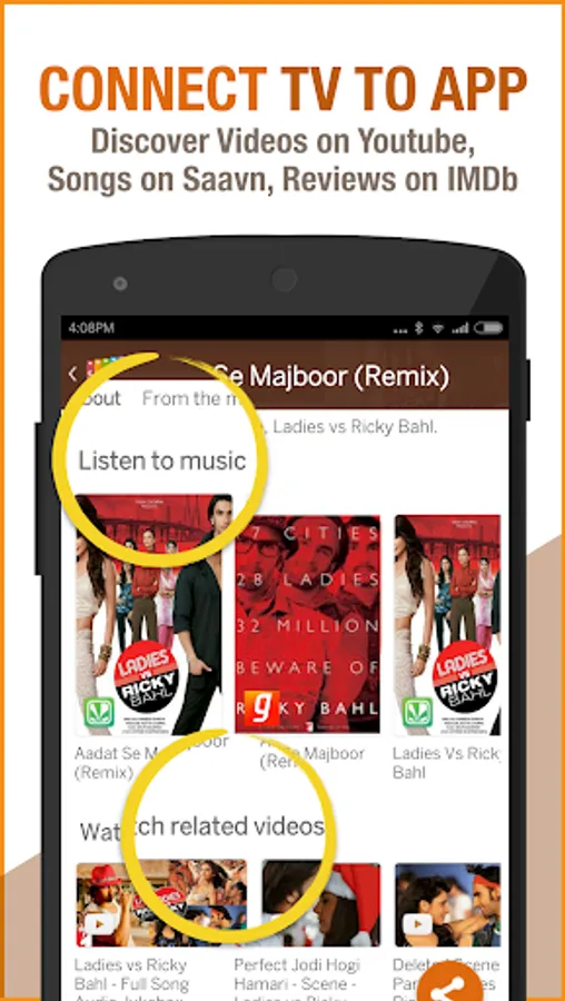 Connect your TV to Apps: For every show, you watch, you can get related merchandize you can buy on Flipkart or Amazon, or get references on IMDB, videos on YouTube, book related movies playing in the cinemas on BookMyShow and even songs on TV can be linked to gaana, saavn for you to listen to music later.