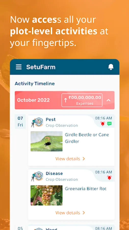 The SetuFarm app is your gateway to avail of multiple services like on-farm weather and operations advisory, pest and disease forecasts, fresh produce supply chain traceability besides many professional services.