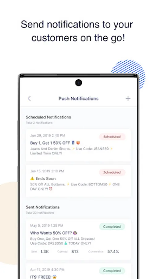 - Abandoned Cart Notifications: Once a cart gets abandoned, your app will automatically send a push notification after the time you have set passes. Reminding customers about their cart increase sales up to 3x.