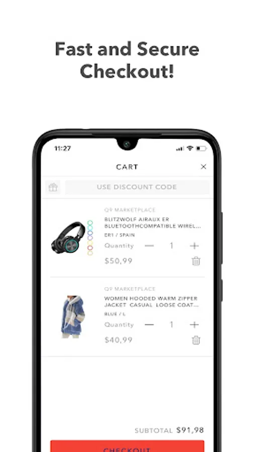 Our app Q9 Marketplace makes it easy to buy what you need. This includes the homepage, account and order information, your cart and the ability to explore and discover what is trending in fashion, toys, accessories, camping, electronics and many more to discover.