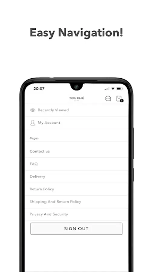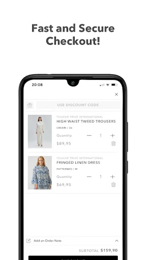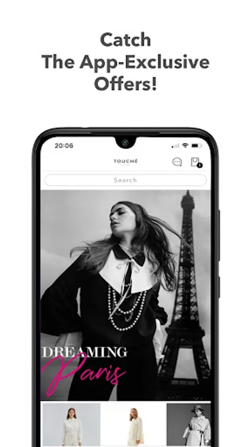Download the Touché Privé mobile application for free to discover and order hundreds of products in many categories such as dresses, trousers, skirts, knitwear, shawls, shirts, tunic, jackets, bags, and order safely.