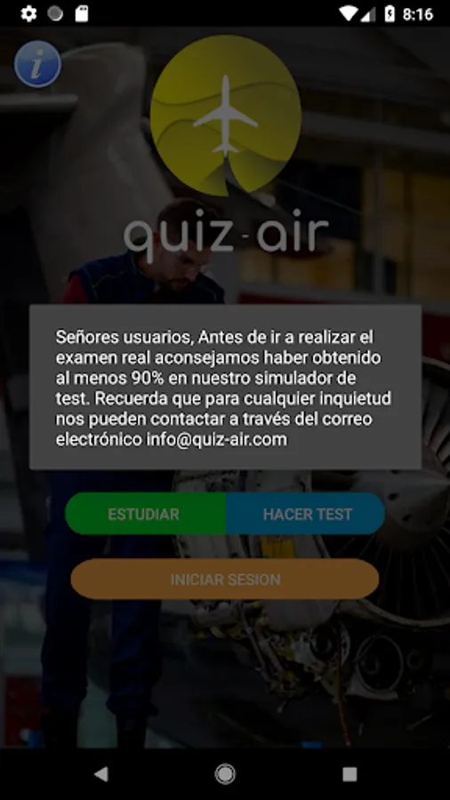 Quiz-Air is the app to help you prepare for the written exam TLA of the Colombian Civil Aeronautics. More than 1300 updated questions and answers will help you pass the final exam TLA and you will have a simulation of the real test so you'll know when you're ready to present. Try it!
