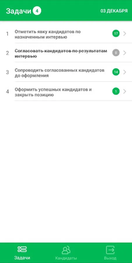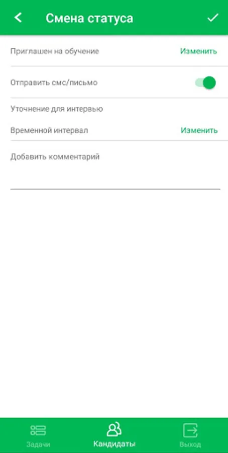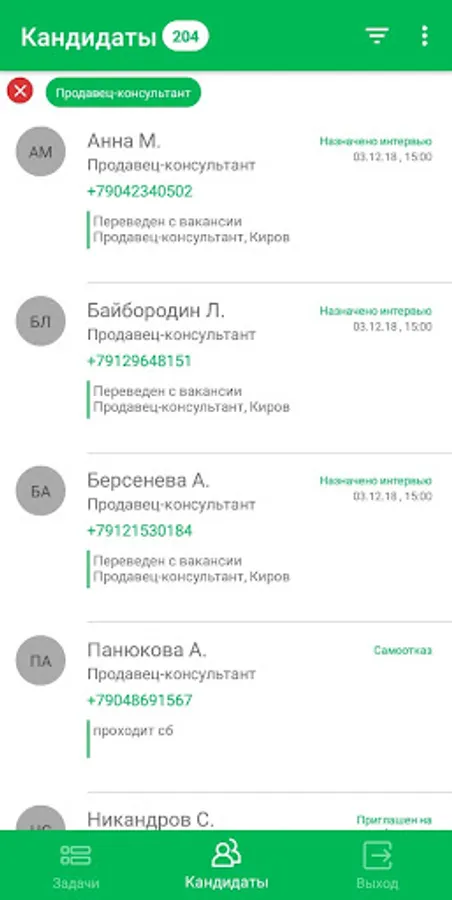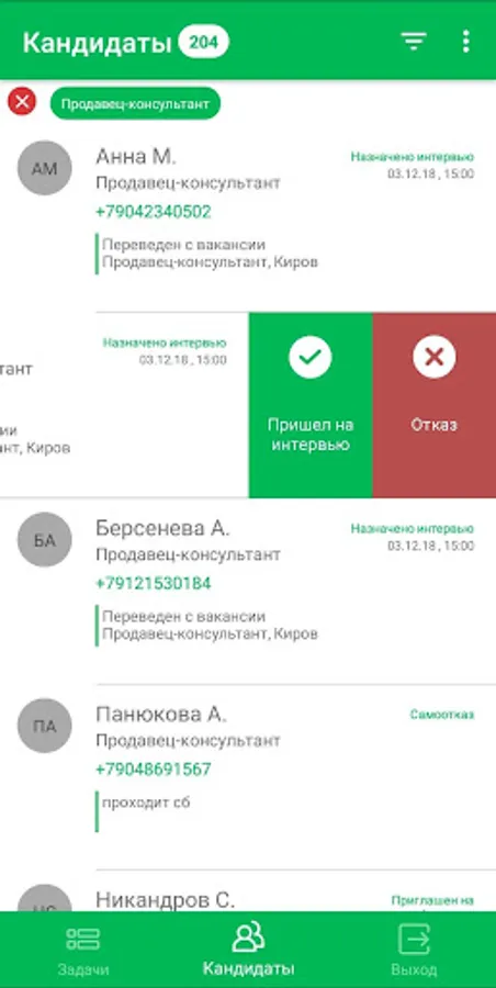 - filtering the list of candidates according to the required parameters (name, vacancy, status, etc.)