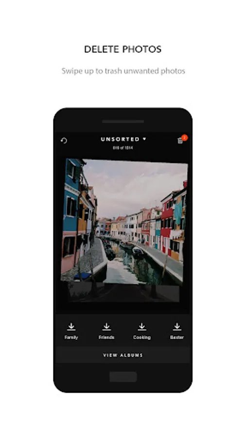 Scroll through your photos in fullscreen and swipe up to delete unwanted photos or pick an album to sort into. Compare similar/duplicate photos and quickly and delete them with a swipe. It’s that easy.