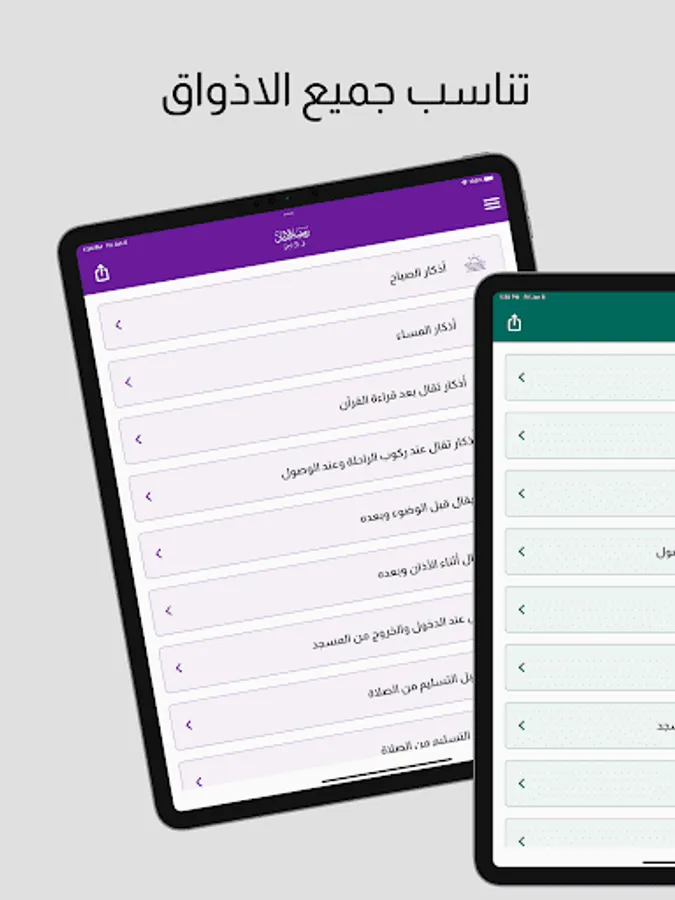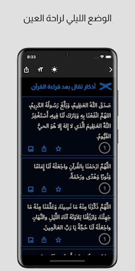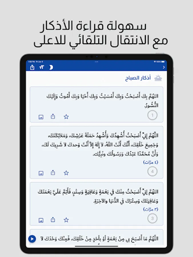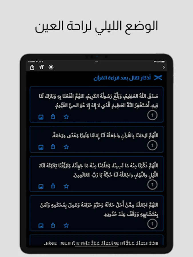 • دعم الوضع الليلي بحيث تكون قراءة الاذكار في الليل سهلة ومريحة للعينين