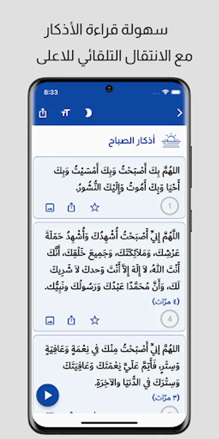 • ميزة العداد للاذكار مع التنبية بالهزاز والانتقال التلقائي