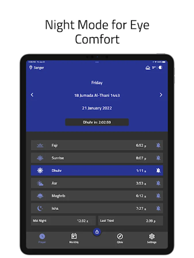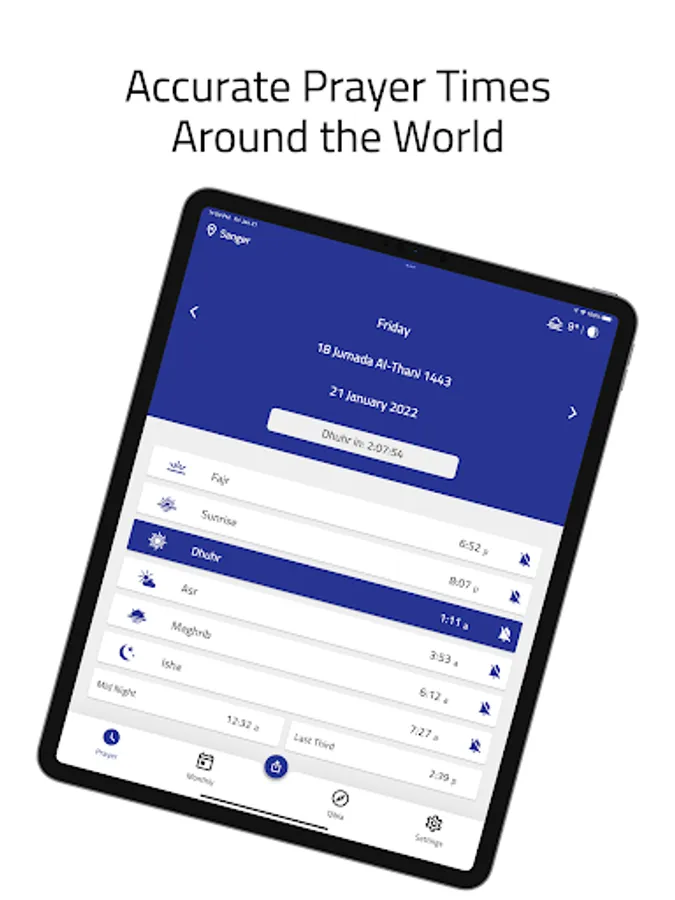 - Home page to display daily prayer times with Hijri and Gregorian date