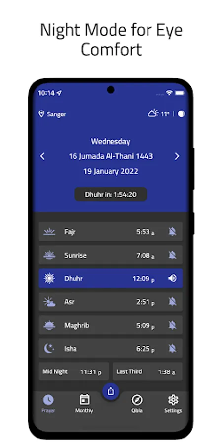 - Display the next prayer and the remaining time to it, including the the ability to view prayer times for coming days or past days easily from the main page