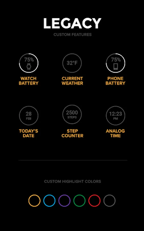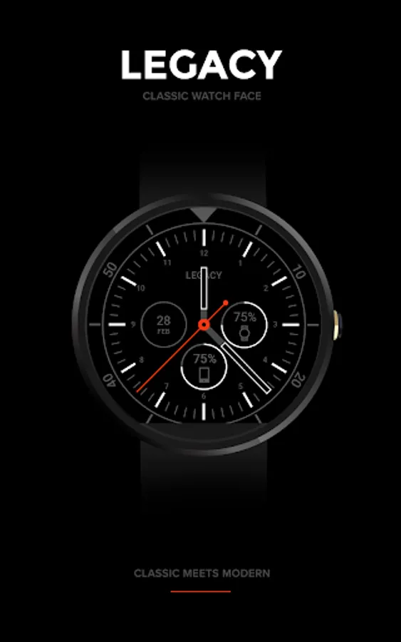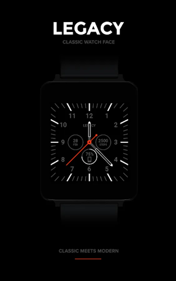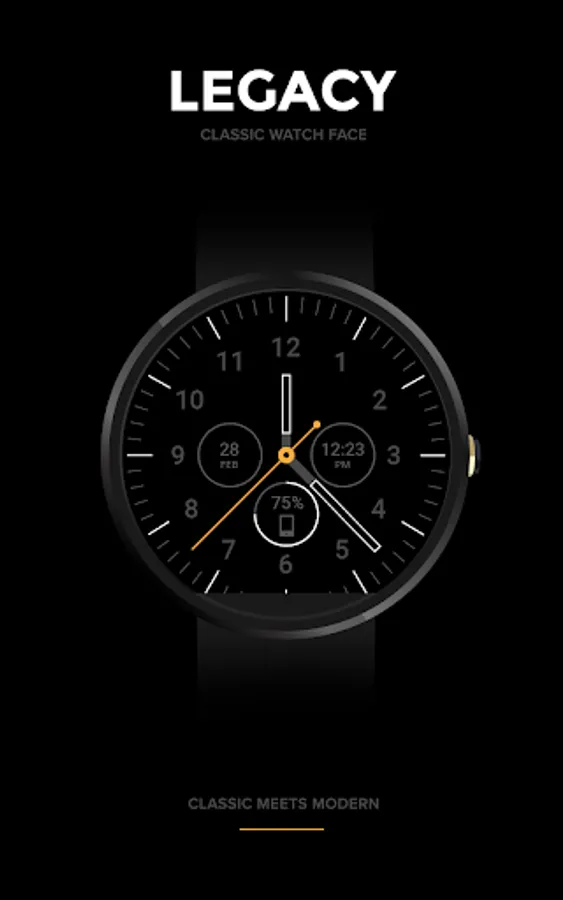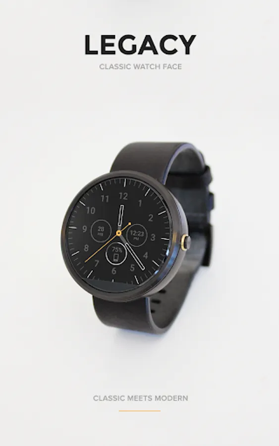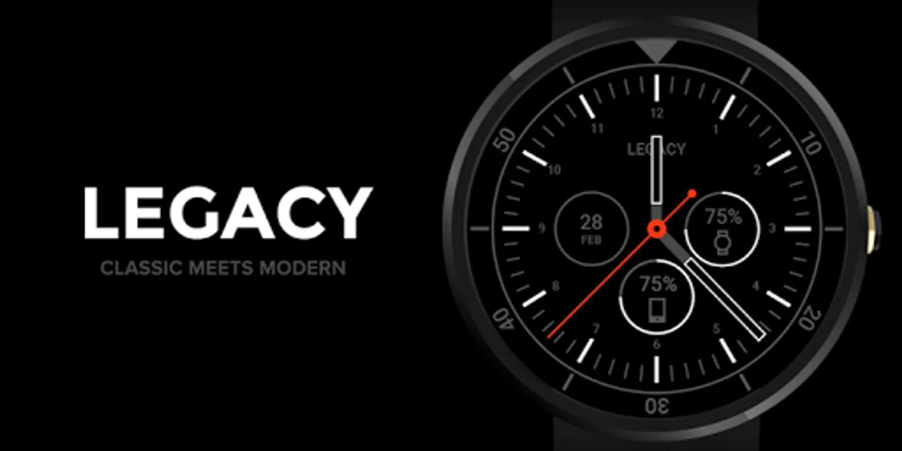 Legacy watch face is a stylish interpretation of a classic watchface combined with the modern functions of Android Wear.