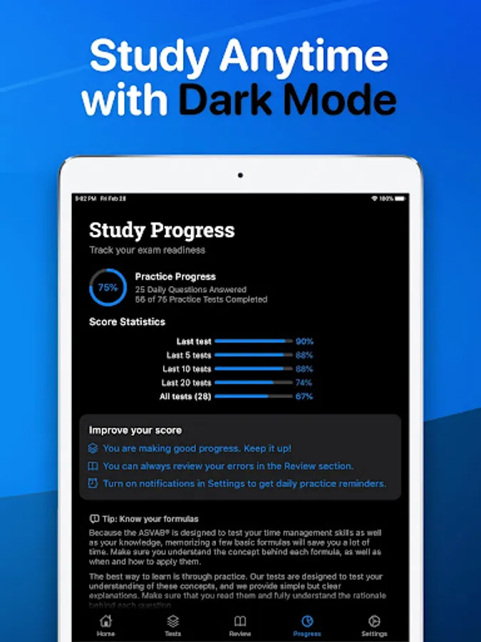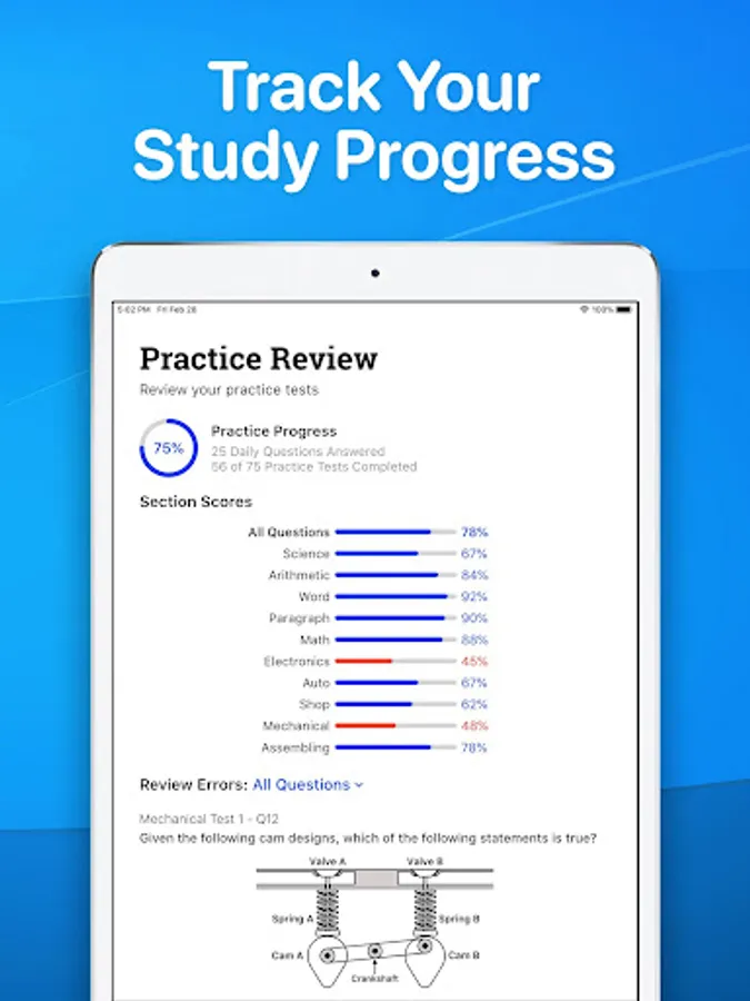 The ASVAB tests are designed to measure aptitudes in four domains: Verbal, Math, Science and Technical, and Spatial. The table below describes the content of the ASVAB tests. There are 10 sections in the ASVAB: General Science, Arithmetic Reasoning, Word Knowledge, Paragraph Comprehension, Mathematics Knowledge, Electronics Information, Automotive Information, Shop Information, Mechanical Comprehension, Assembling Objects. The Armed Forces Qualification Test (AFQT) is a component of the ASVAB that assesses candidates for placement into the Armed Services, and considers the Arithmetic Reasoning, Word Knowledge, Paragraph Comprehension and Mathematics Knowledge sections of the ASVAB. Our app covers all 10 sections of the ASVAB.