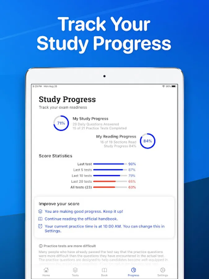 - You can track how many questions you have done correctly, incorrectly, and get a final passing or failing score based on official passing grades