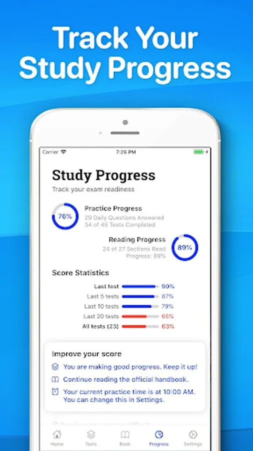 - Track Past Test Results - Individual tests will be listed with pass or fail and your mark