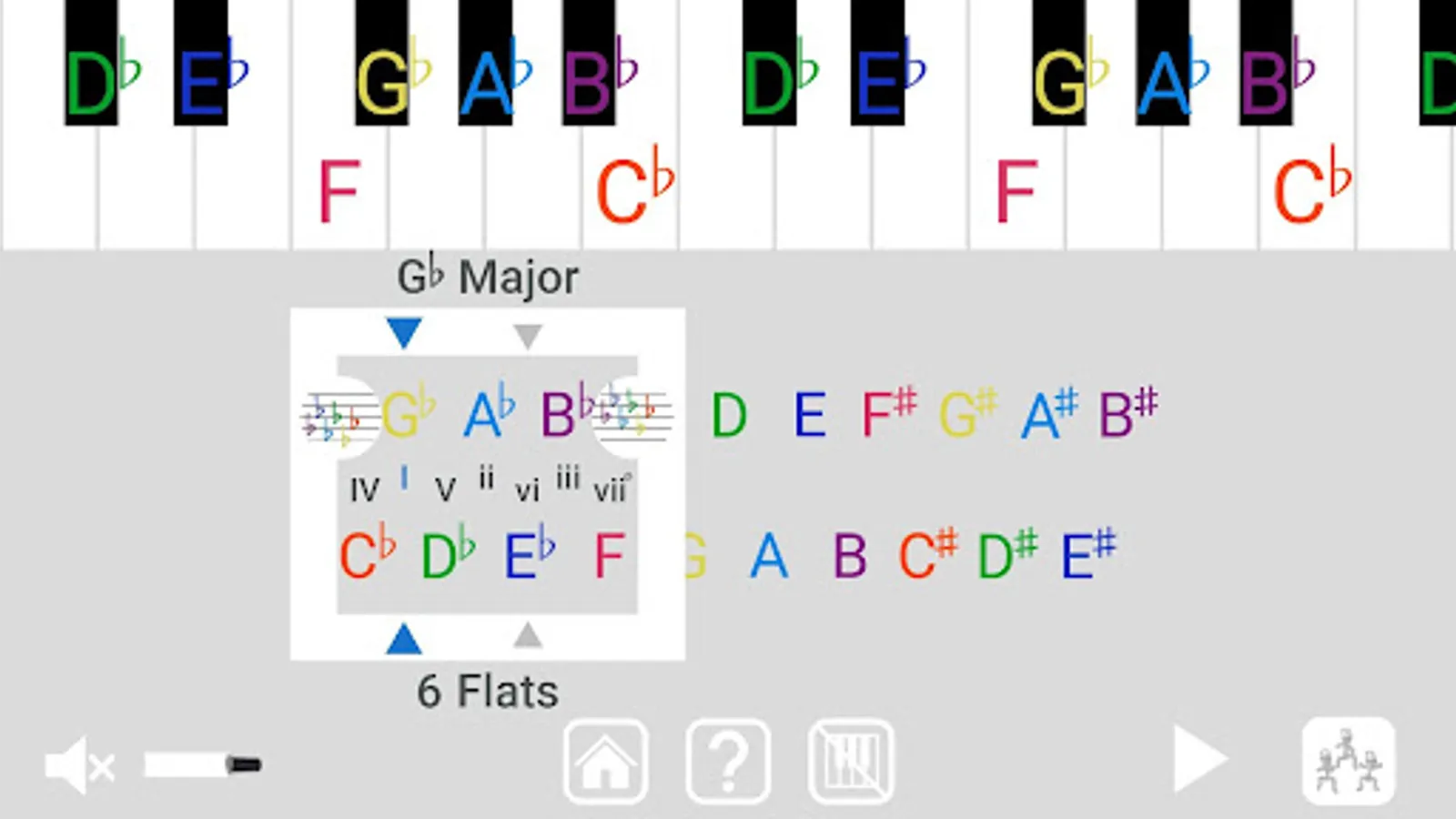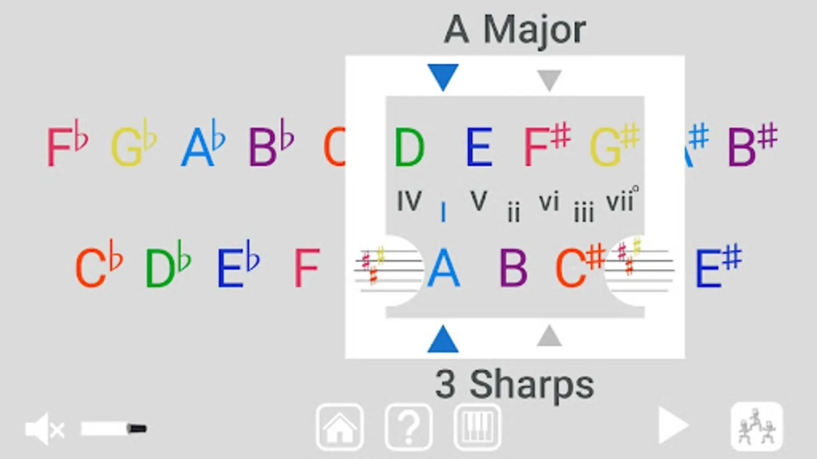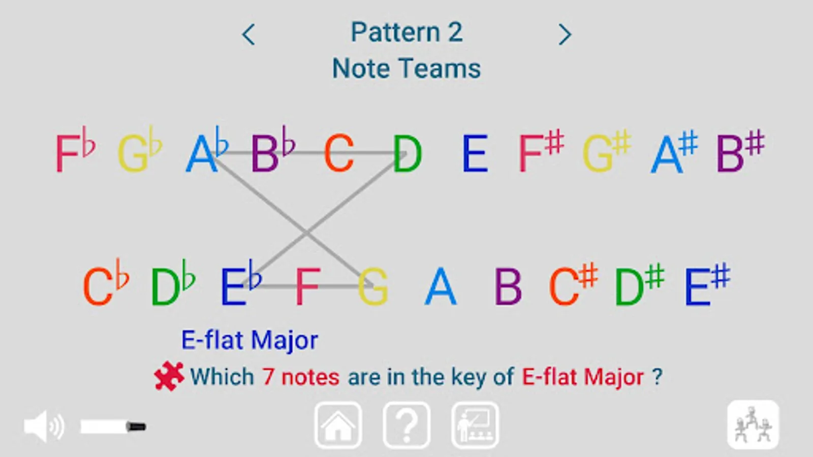 Each set of 7 notes is a Note Team with a unique key signature that shows which notes on the team are sharp or flat.