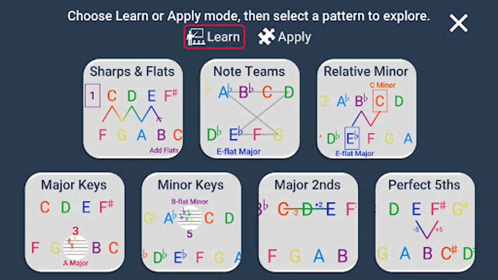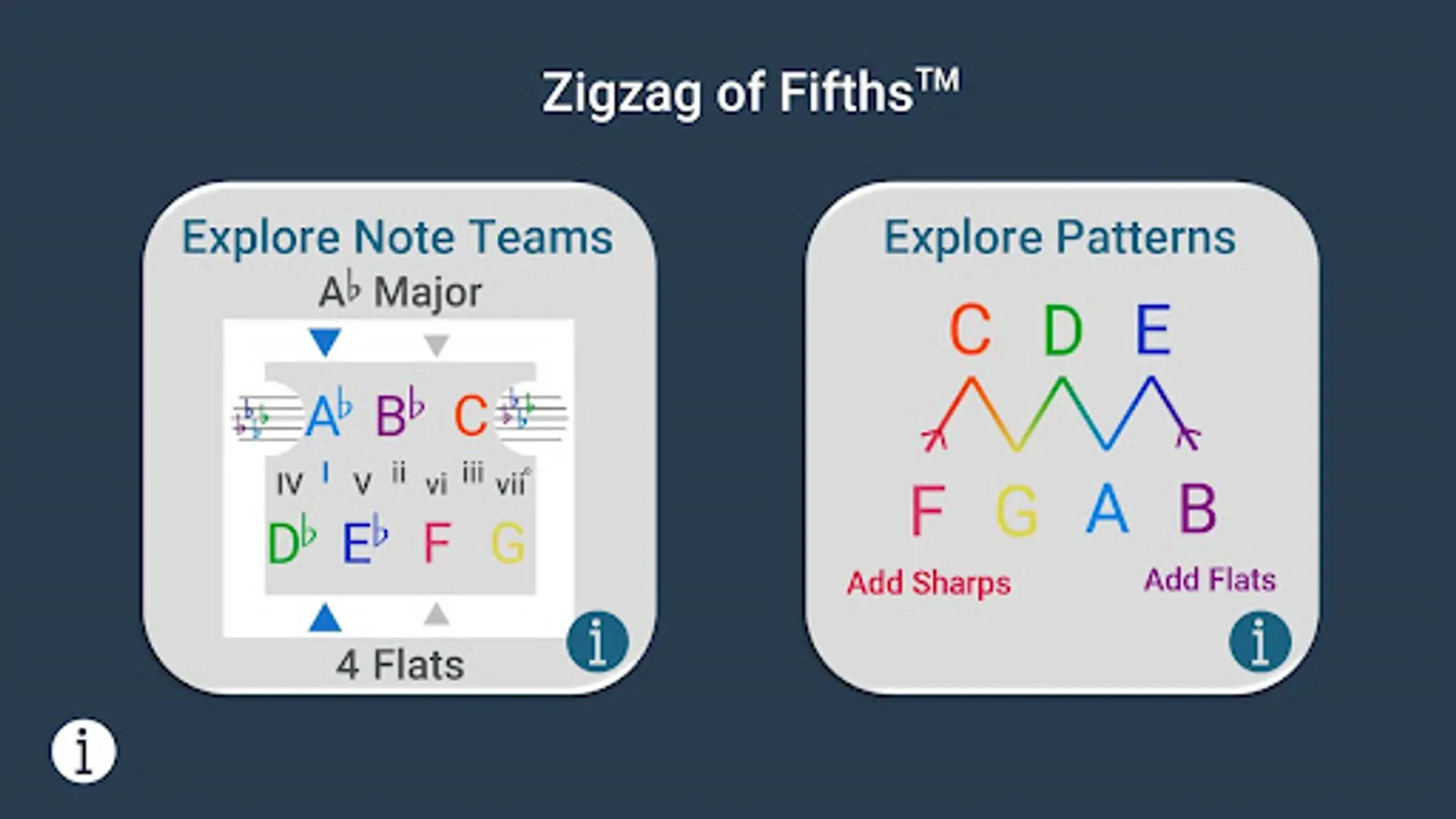 BONUS activities: Explore 7 different patterns within the Zigzag of Fifths, each with a learn and apply mode:
