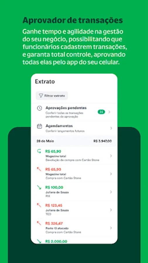 Gain agility in managing your business, allowing employees to submit transactions for approval and ensure full control of them through your cell phone app. Don't waste any more time on your bank's Internet Banking.