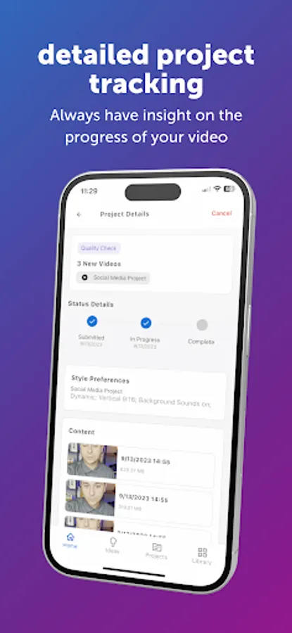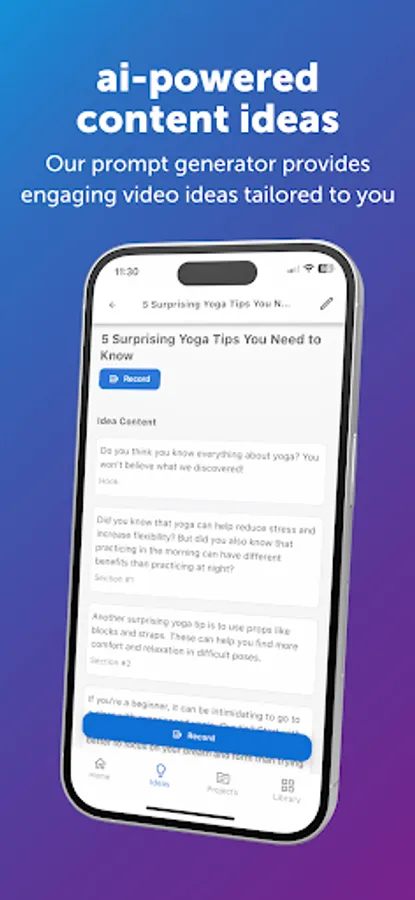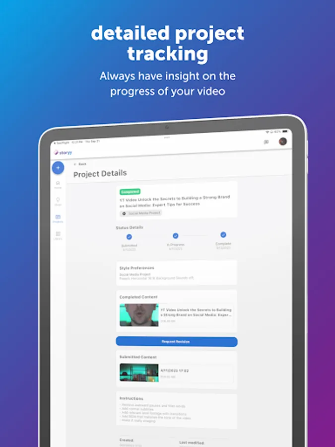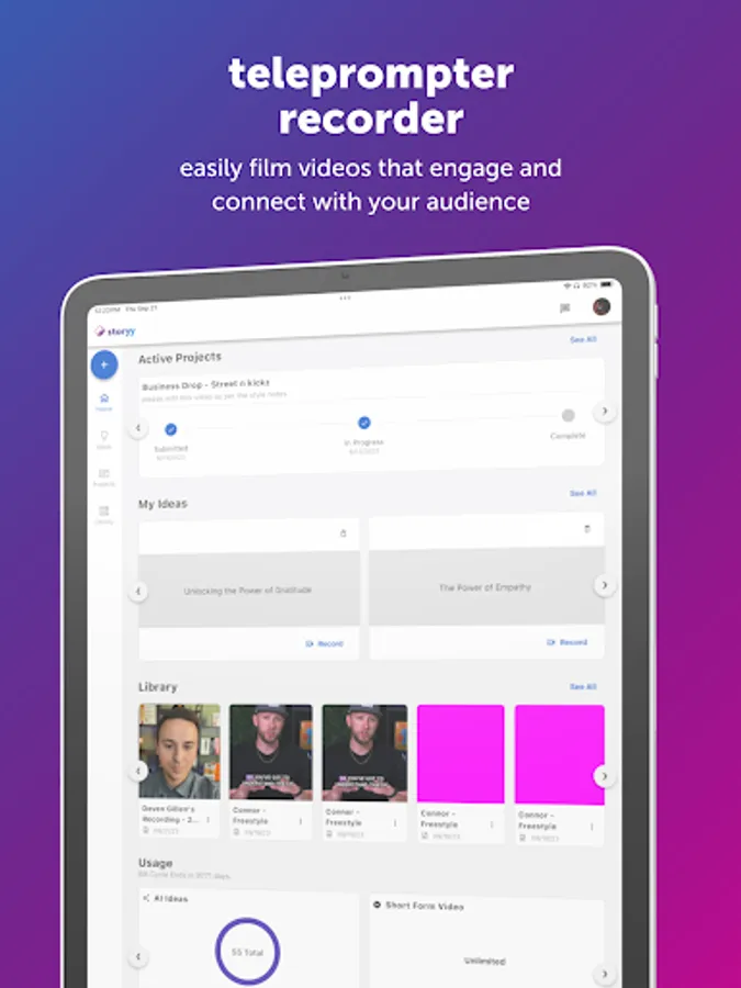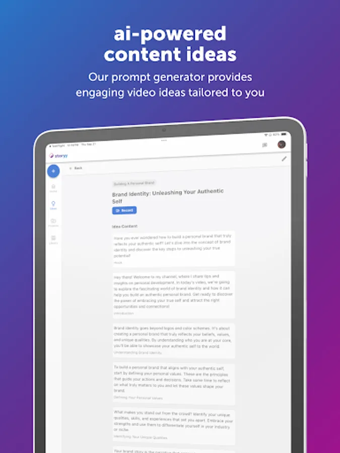 With the Storyy app, you can discover content ideas that matter to you, powered by AI but customized to you.. You can either craft videos right in the app or share your own content with us for a professional touch. We'll make sure to keep you in the loop about your content's progress and let you know when it's ready to shine in front of the world.