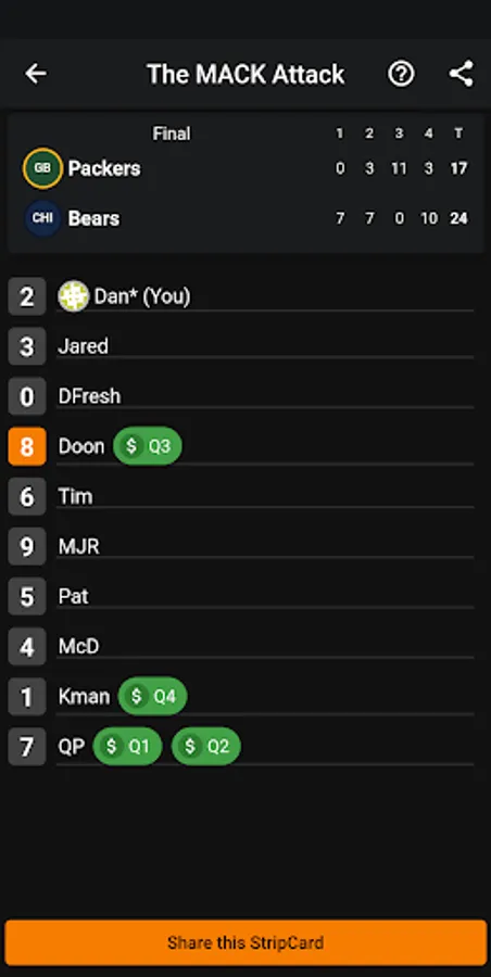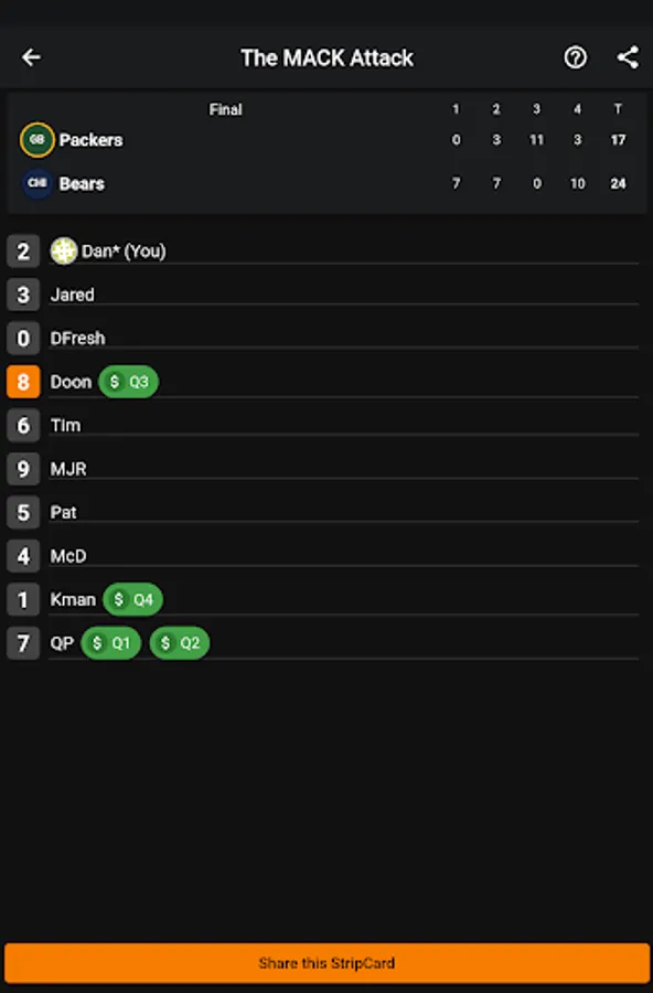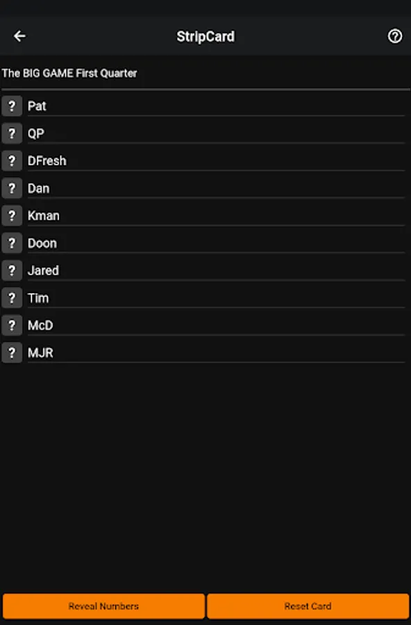 Choose your place in the StripCard and wait for the event to begin. The numbers are hidden until the event begins. Enjoy some friendly competition as you watch the game together and hope you are in the winning position!