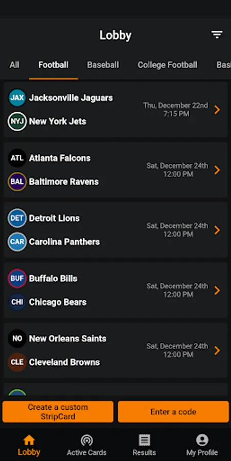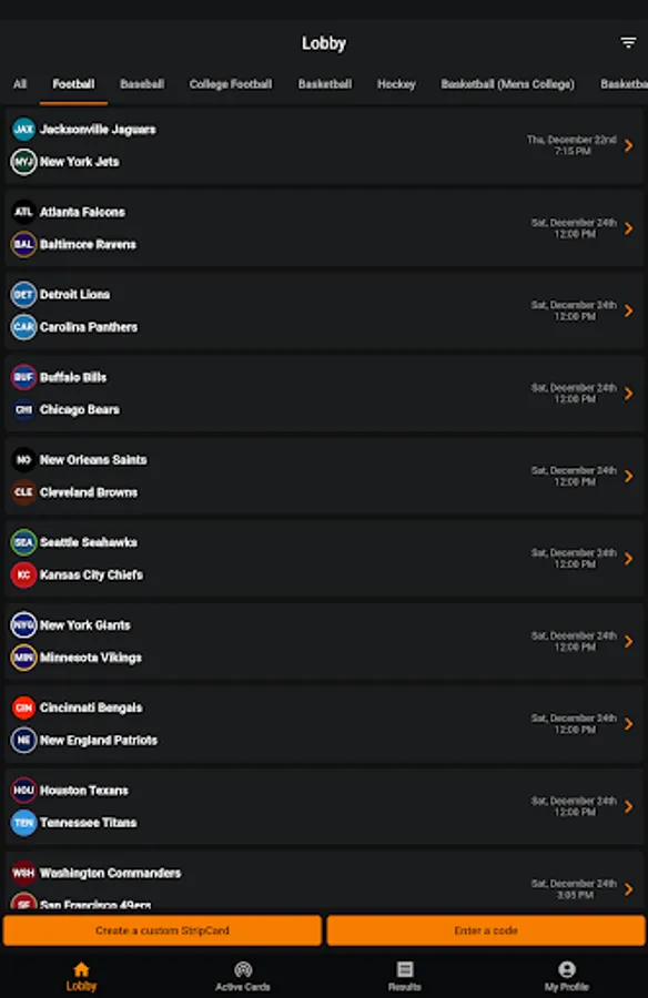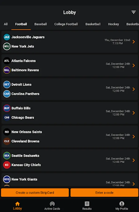 Sporting events are automatically populated and scores are constantly updated. StripCard matches update live throughout the duration of the event so you always know who is currently in the winning slot