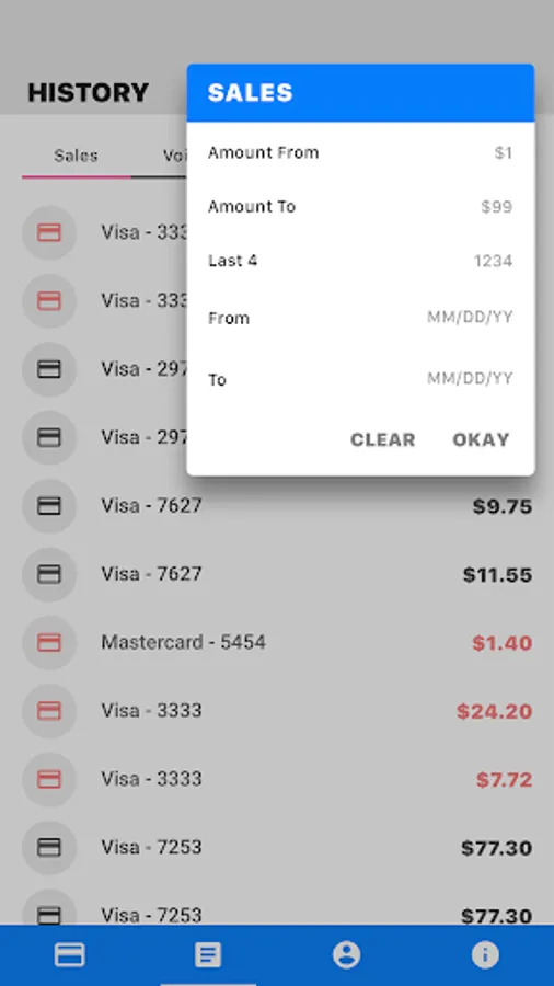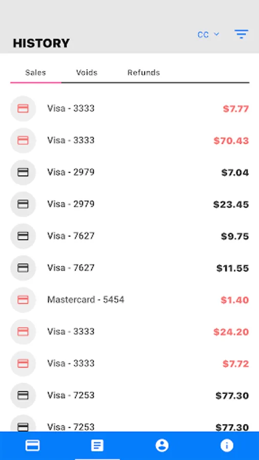 You can track all sales activities within the app: approved transactions, declined, reasons for the declined, and historical transaction activity and quickly enabled you to refund or void transactions.