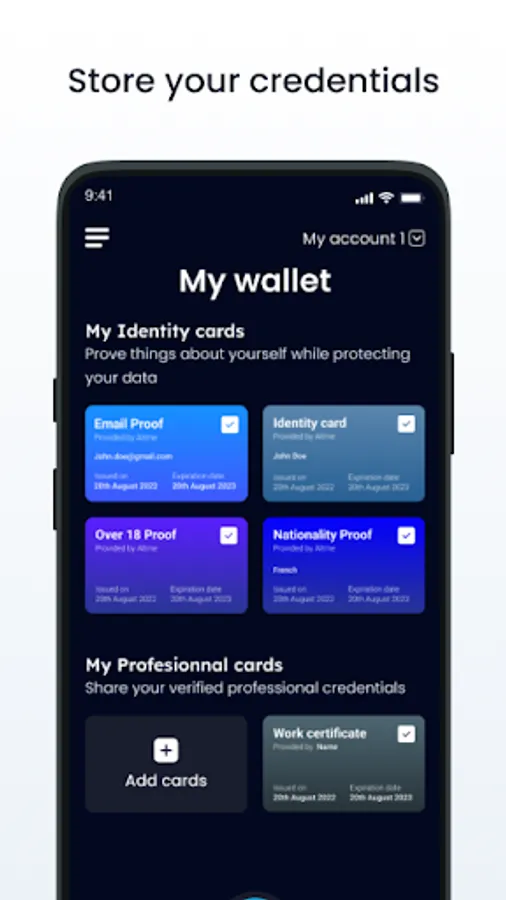 Wallet templates: Over 18 proof, Decentralized KYC, Diplomas, Certificate of employment, Experience certificate, Skills certificate, company pass , Proof of email, Proof of telephone, Loyalty card, Vouchers, Gift card, Membership cards, Student card, Resident card,...