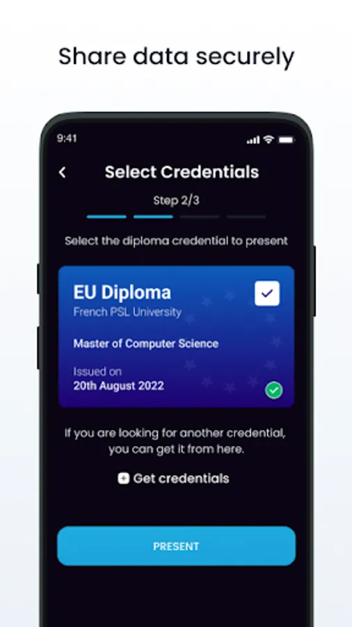 Your personal data is stored only on your smartphone, it cannot be seen by anyone and as with your traditional credentials you alone present it to whomever you wish. Welcome to the future of Digital Identity !