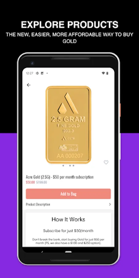 Pay $50, $100 or $250 per month, which will accumulate until your account reaches the price of your Acre Gold Bar. We'll ship you the Gold bar every time your account hits the price threshold (less our shipping and fulfillment fee) and credit any remainder to your next Gold bar. There's a one-time upfront membership fee of $12. Passive savings into a safe asset.