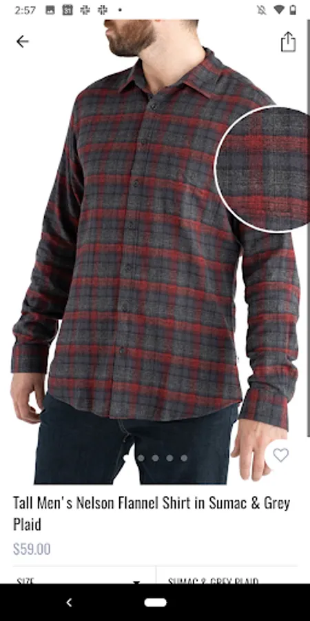 • High quality photos of tall clothing, with a pinch to zoom feature for detailed exploration of fabrics and features.