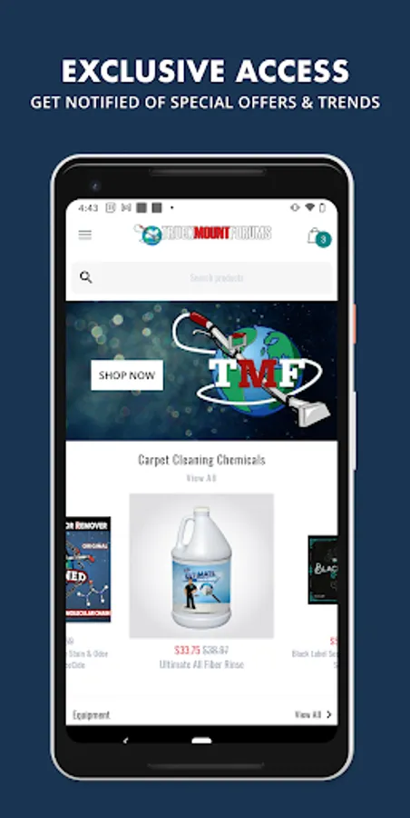 The best place to buy carpet cleaning equipment and chemicals from your mobile phone or tablet! TruckMountForums brings you our TMF Shop which helps you SAVE money on all types of chemicals and equipment. Plus you can get discounts on our products and free shipping on most of our chemical line by purchasing from the TMF Shop app!