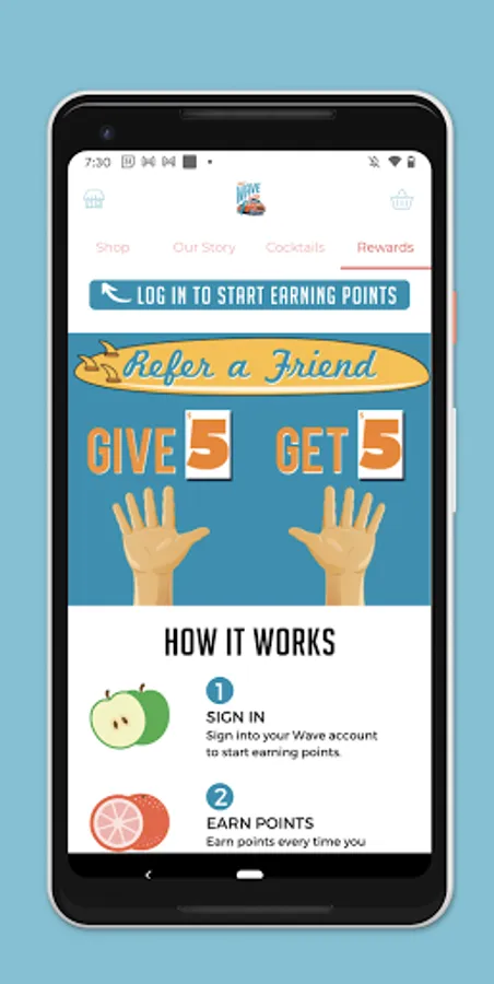 Welcome to the Wave Soda App! Order drinks and merchandise to earn loyalty points and rewards. Like and share your favorite Wave products.