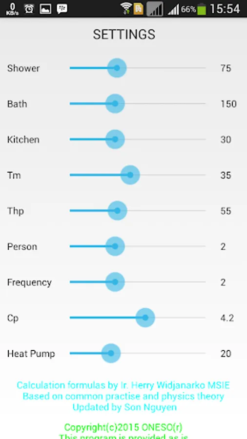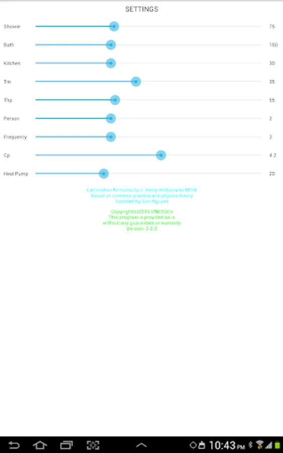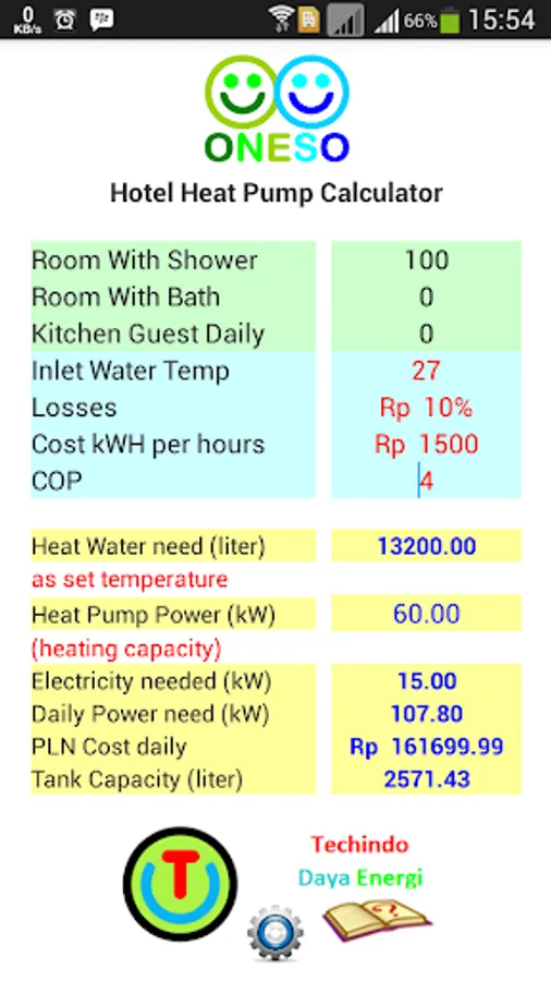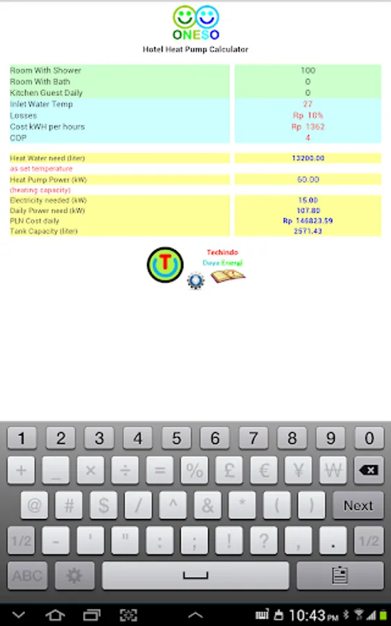 Easy tool to calculate the power of heat pump and tanks for commercial hotel, based on the need (rooms) and setting parameter which you can change according your standard. The manual can be read on http://www.techindo.co/Oneso.htm or just click the bottom right of the application