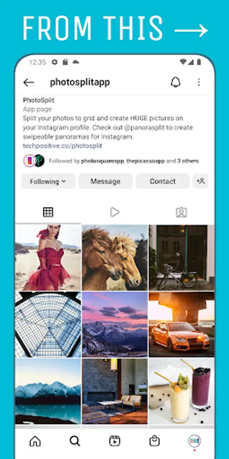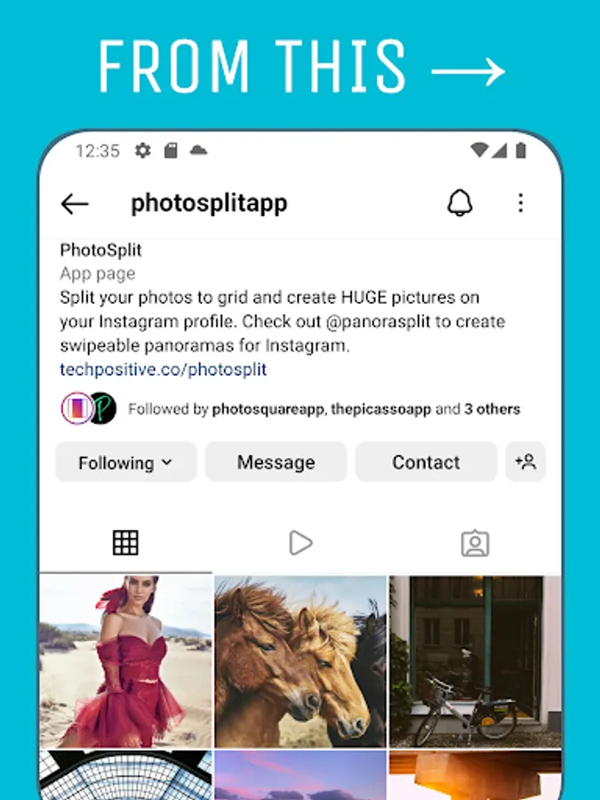 PhotoSplit lets you slice any picture into a 1x2, 1x3, 2x3, 3x3, 4x3 & 5x3 grid while keeping it in high resolution. It then quickly lets you post the split images to Instagram to show it as one big photo on your profile.