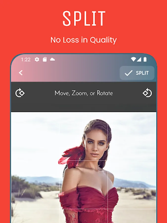 With PhotoSplit, you can zoom in, move, or even rotate your photo to instantly see how it will look like on your Instagram profile.