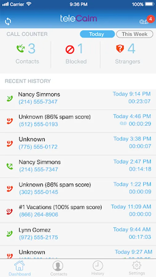 Easily monitor your loved one’s phone activity. The Dashboard and Call History screens indicate whether calls were contacts or strangers, and whether they were blocked due to quiet hours or repeat dialing. Click on the voicemail icon to hear messages.