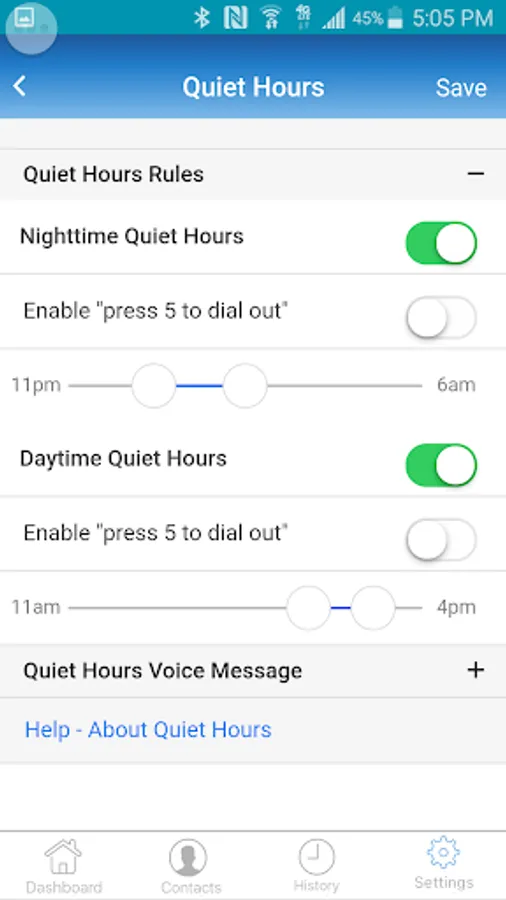 Use the Quiet Hours feature to prevent disruptive calls during important times of the day or night. When enabled, calls to your loved one are blocked or sent to voicemail, and your loved one will hear your personalized message if they try to dial out.