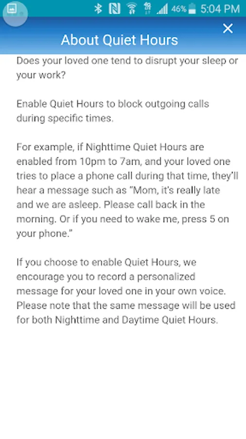 - Set "Quiet Hours" to limit calls during important 'do not disturb' times. This feature can help if a loved one loses track of time as dementia progresses.