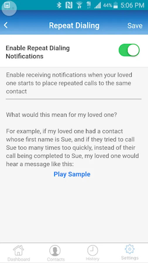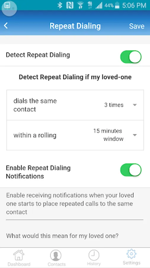- Enable "Repeat Dialing" detection if your loved one has a disruptive repeat dialing habit. When enabled, the Repeat Dialing feature automatically prevents repeated calls to the same number.