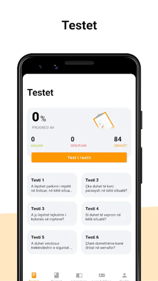 Përmes krijimit të një profili personal në aplikacion, ju do të keni mundësinë të ndiqni përparimin tuaj në mesim dhe testim. Profili juaj ruaj statistikat e testeve të kaluara dhe rezultatet e arritura, duke ju ndihmuar të vlerësoni zhvillimin tuaj dhe të identifikoni fushat që kërkojnë përmirësim.