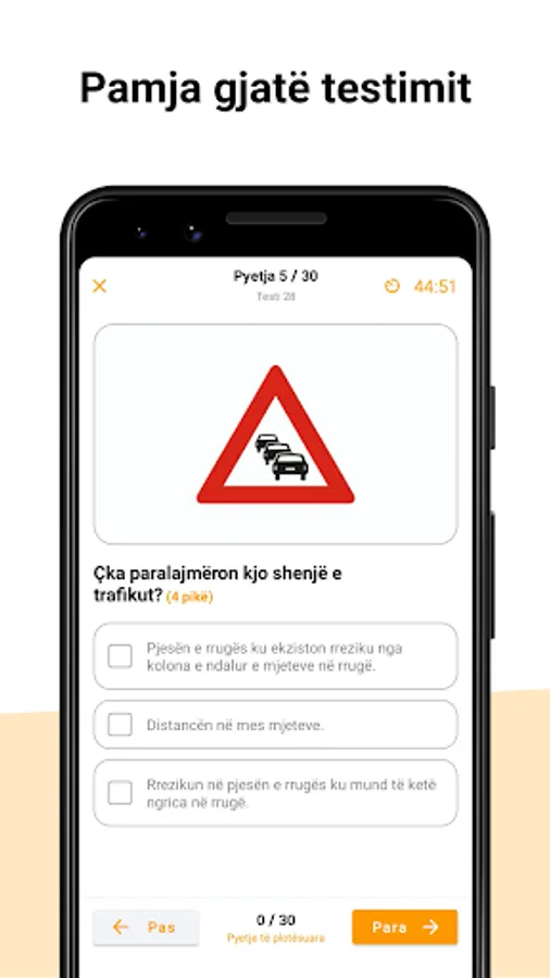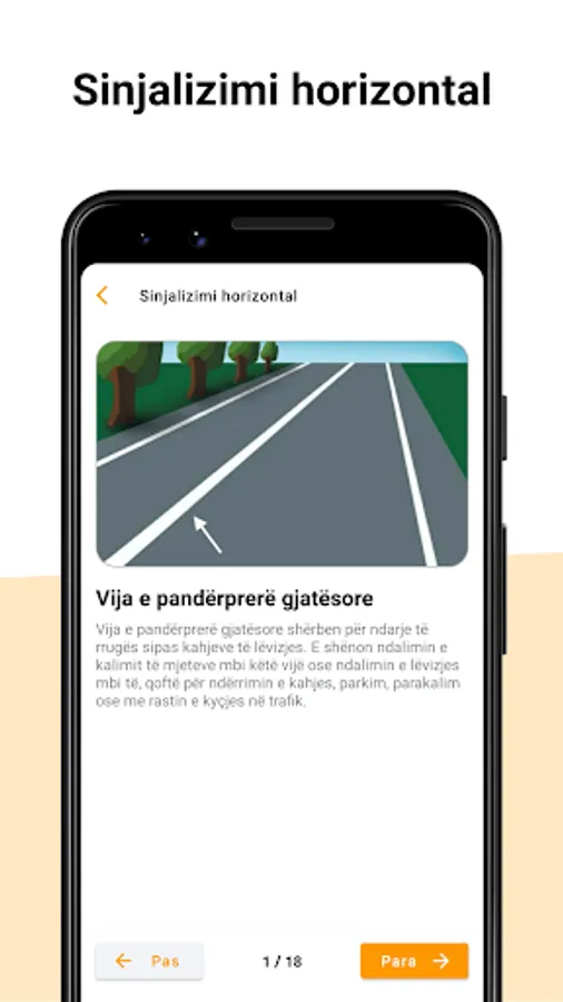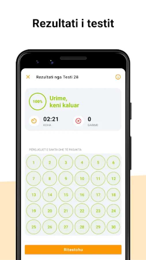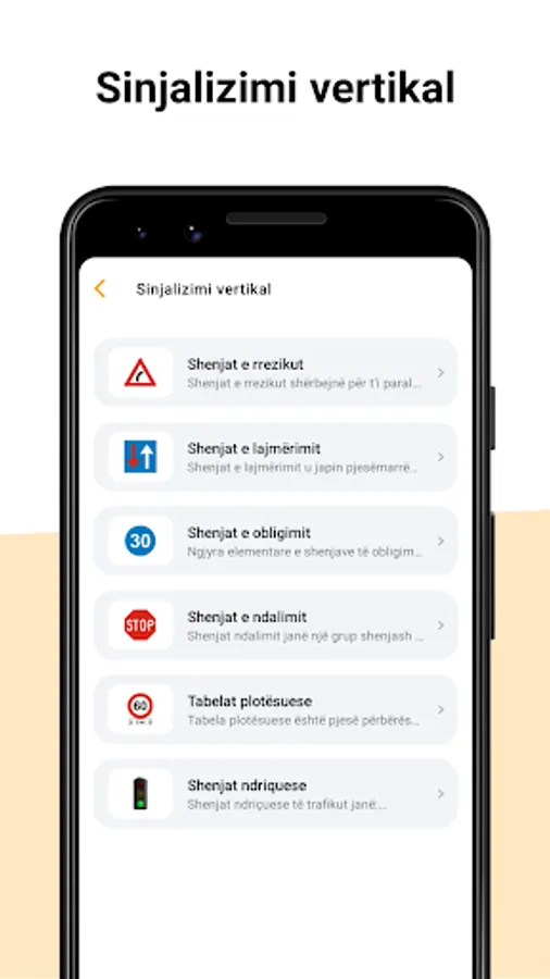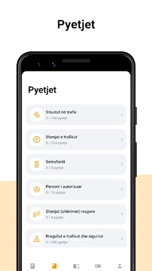 Aplikacioni përmban një koleksion të gjerë të testeve dhe pyetjeve të ndara në kategori për secilën kategori të patentës shofer. Ju do të keni mundësinë të praktikoni njohuritë tuaja duke zgjidhur pyetjet e testimeve dhe të merrni rezultate të menjëhershme. Kjo ju ndihmon të përgatiteni në mënyrë efektive për provimet e patenteve shofer. Përmes testeve dhe pyetje të ndryshme do të keni shumë të lehtë përgatitjen e Testit Final.