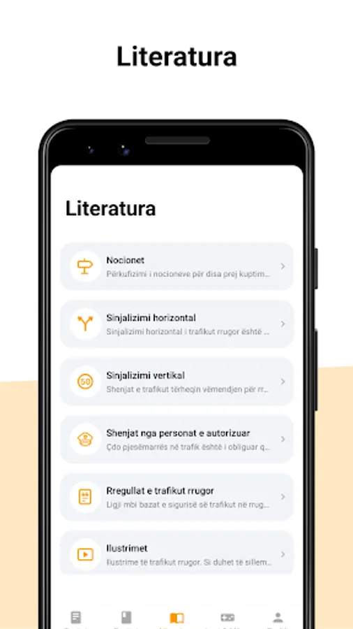 Aplikacioni furnizon një bibliotekë të pasur me literaturë të ndryshme të rregullave të qarkullimit rrugor, sigurisë rrugore dhe teknikave të shoferimit. Informacioni është i përditësuar dhe i bazuar në ligjet dhe udhëzimet më të fundit, duke siguruar që ju të jeni në gjendje të merrni informacionin e saktë dhe aktual.